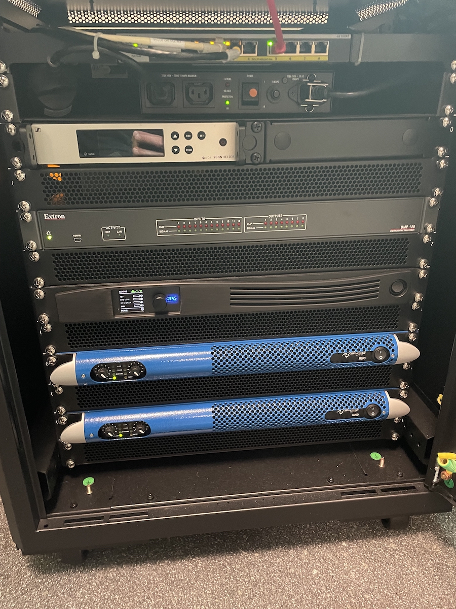 Nous avons également réutilisé le processeur audio existant, une DMP128 de la marque Extron, en mettant à jour l’ensemble de ses réglages pour qu’ils correspondent parfaitement à cette nouvelle installation : les enceintes Active Audio sont un matériel de très grande qualité mais ne donnent le maximum de leurs capacités que quand ces réglages sont faits avec attention. Nous avons donc – comme sur chacune de nos installations – procédé à des mesures pointues pour avoir des données précises sur le comportement des enceintes dans l’édifice. Ces mesures nous permettent ensuite d’optimiser le matériel pour qu’il réponde très exactement aux besoins du client… et de ce lieu unique.