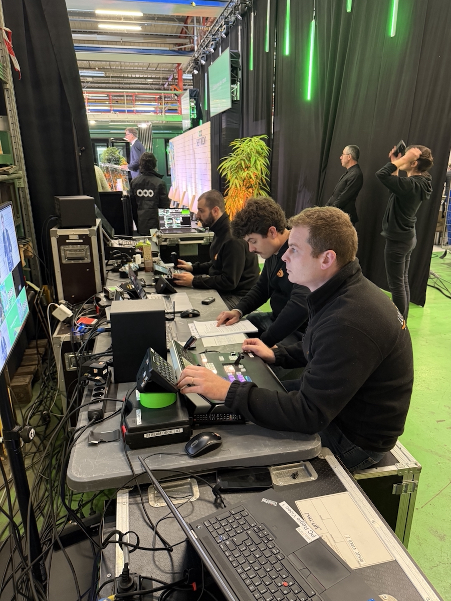 Puis nous avons mis en œuvre la proposition validée par les clients : création de la scène, sonorisation et éclairage, captation vidéo pour retransmission en direct sur plusieurs écrans, etc.